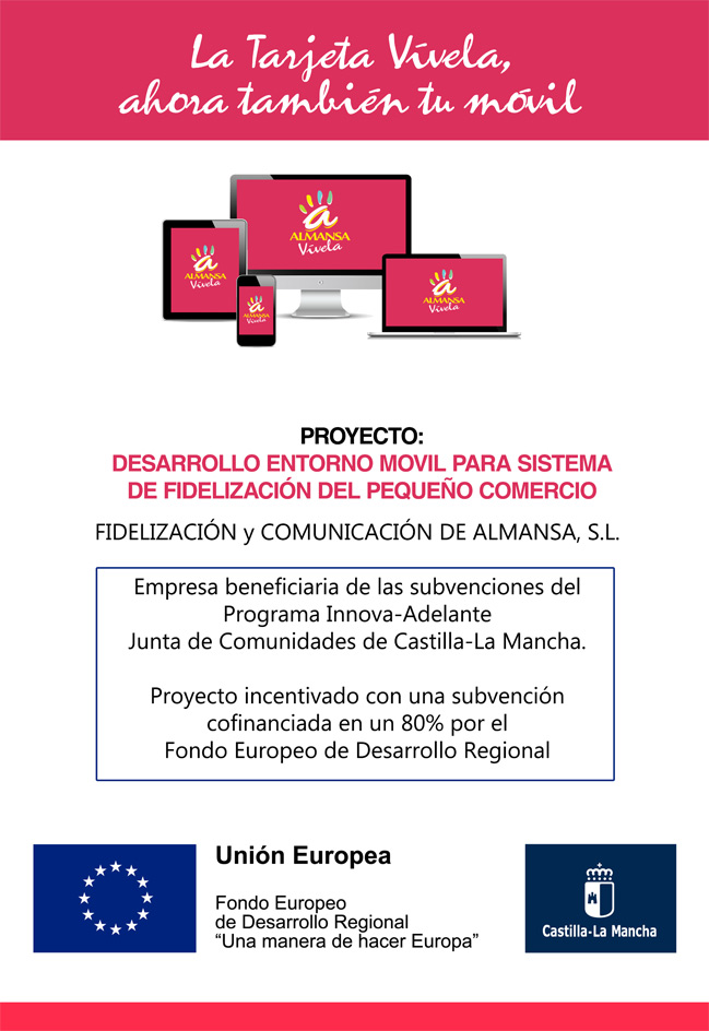Nuestra empresa, FIDELIZACIÓN y COMUNICACIÓN DE ALMANSA, S.L. beneficiaria de las subvenciones del Programa Innova-Adelante de la Junta de Comunidades de Castilla-La Mancha ha desarrollado este proyecto, incentivado con una subvención cofinanciada en un 80% por el Fondo Europeo de Desarrollo Regional.
